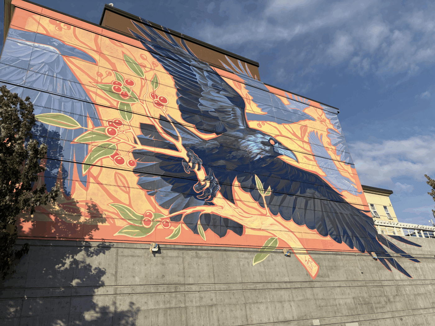Joey Rose’s art is vibrant, yet familiarly symbolic; CCS staff were able to brainstorm how they could work with this style in a meaningful tribute to the Francis Place and Bellingham communities. Two key symbols appear in the mural: the raven and the huckleberry branch.